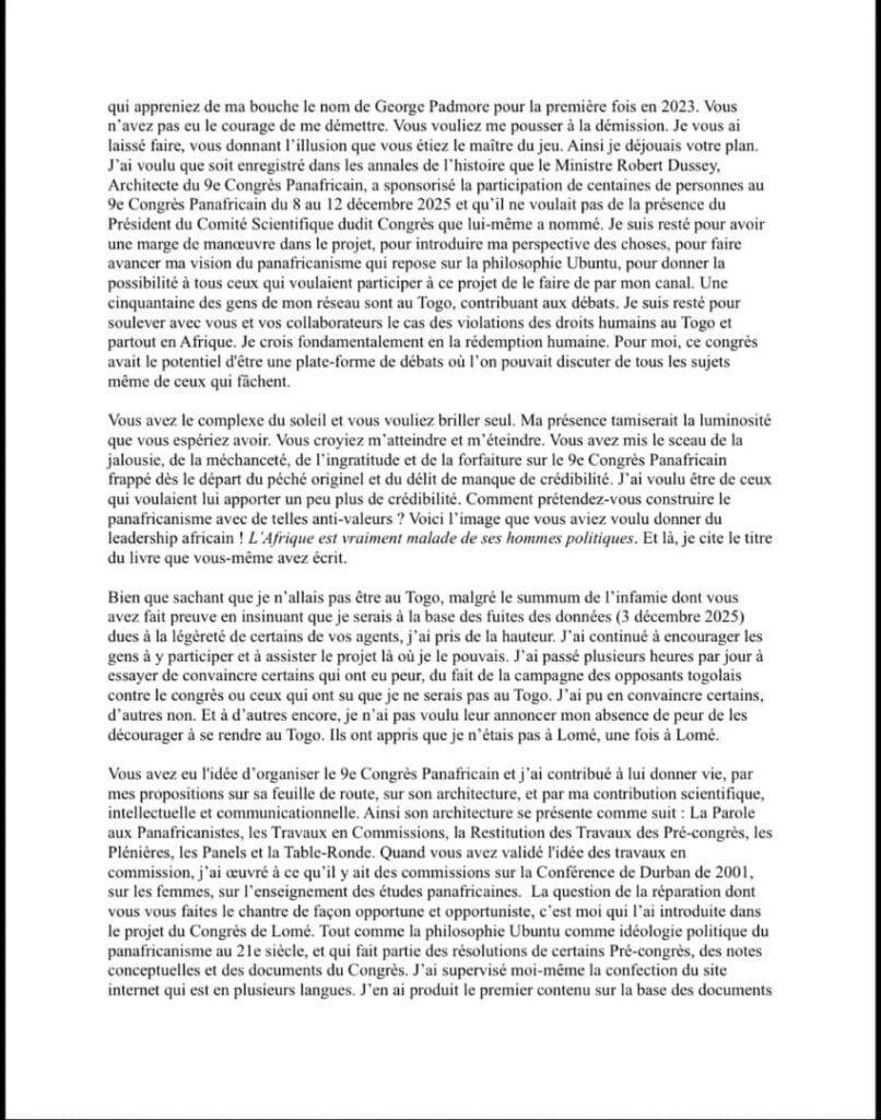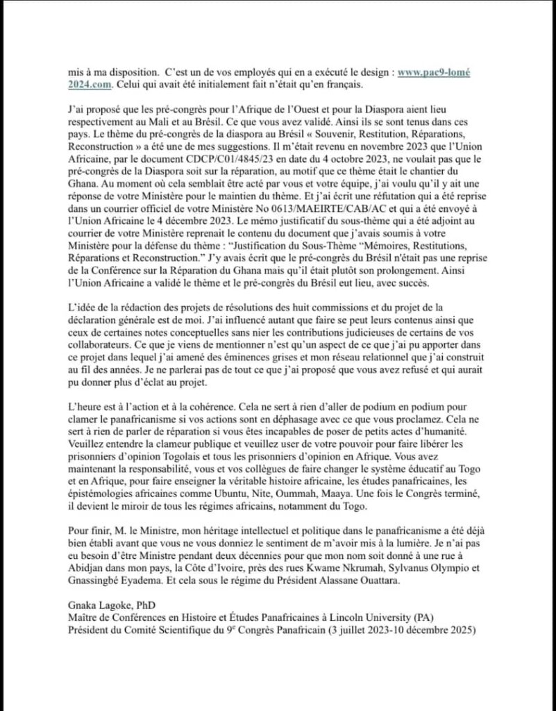 Un incident majeur vient ternir le 9ᵉ Congrès Panafricain de Lomé. Le Dr LaKa Lagoke, président du Comité scientifique de l’événement, a annoncé sa démission dans un courrier particulièrement sévère adressé au ministre togolais des Affaires étrangères, Pr Robert Dussey. Dans cette lettre au ton tranchant, il révèle les raisons de son absence à Lomé et accuse le ministre de l’avoir écarté, malgré son rôle central dans l’élaboration des grandes thématiques du congrès.