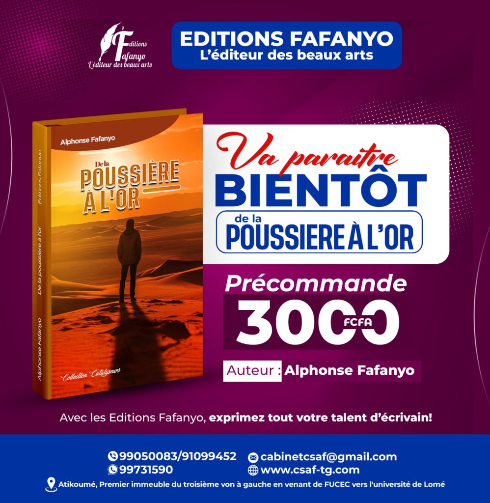 Le nouvel ouvrage d’Alphonse Fafanyo, « De la Poussière à l’Or », se prépare à faire son grand lancement. Actuellement disponible en précommande pour seulement 3000 FCFA, ce livre promet d’être un véritable trésor littéraire pour tous ceux en quête d’inspiration et de nouvelles perspectives professionnelles.