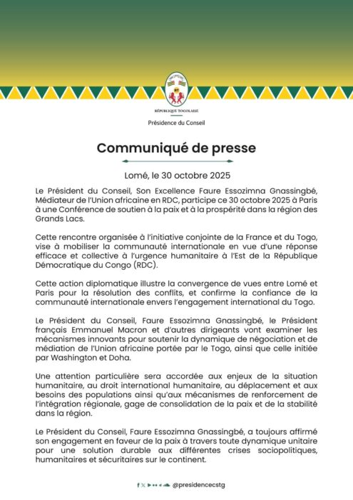 Le Togo continue de marquer des points sur la scène diplomatique africaine. Après Luanda, le président Faure Essozimna Gnassingbé est attendu à Paris ce mercredi 30 octobre 2025. Il participera à la Conférence internationale de soutien à la paix et à la prospérité dans la région des Grands Lacs. Aux côtés du président français Emmanuel Macron et d’autres dirigeants africains, le chef de l’État togolais portera la voix du dialogue et de la stabilité. Cette rencontre vise à trouver des solutions durables pour une région toujours fragilisée par les conflits.