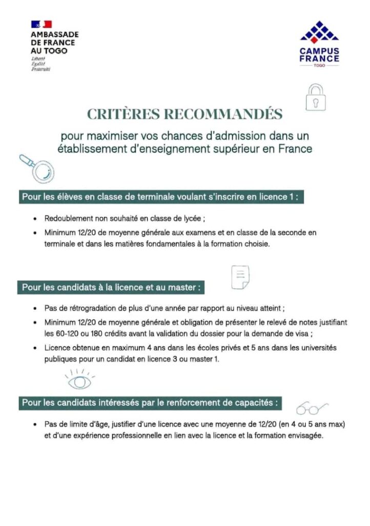 Chaque année, de nombreux étudiants africains notamment togolais rêvent d’intégrer une université ou une école en France. Mais pour réussir, il ne suffit pas d’avoir de la motivation. Les autorités françaises et les établissements d’enseignement supérieur appliquent des critères stricts pour sélectionner les candidats. Connaître ces exigences en amont peut faire la différence entre une candidature acceptée et un refus de visa.