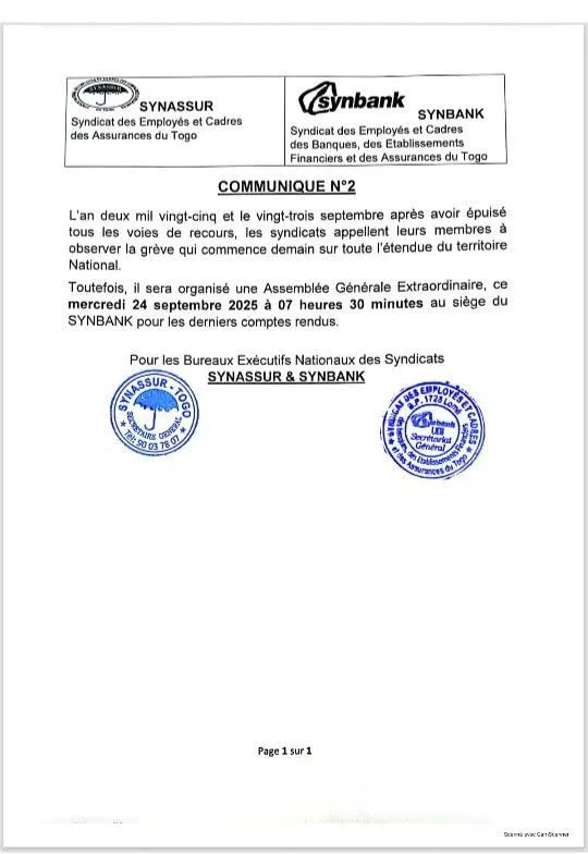 Le secteur bancaire togolais traverse une zone de turbulences. Le Syndicat national des assureurs (SYNASSUR) et le Syndicat des banques (SYNBANK) ont annoncé une grève générale ce mercredi 24 septembre sur l’ensemble du territoire national. Cette décision radicale est l’aboutissement d’un long processus de négociations infructueuses entre les syndicats, les autorités compétentes et la direction de deux grandes institutions financières : SUNU BANK et ECOBANK.