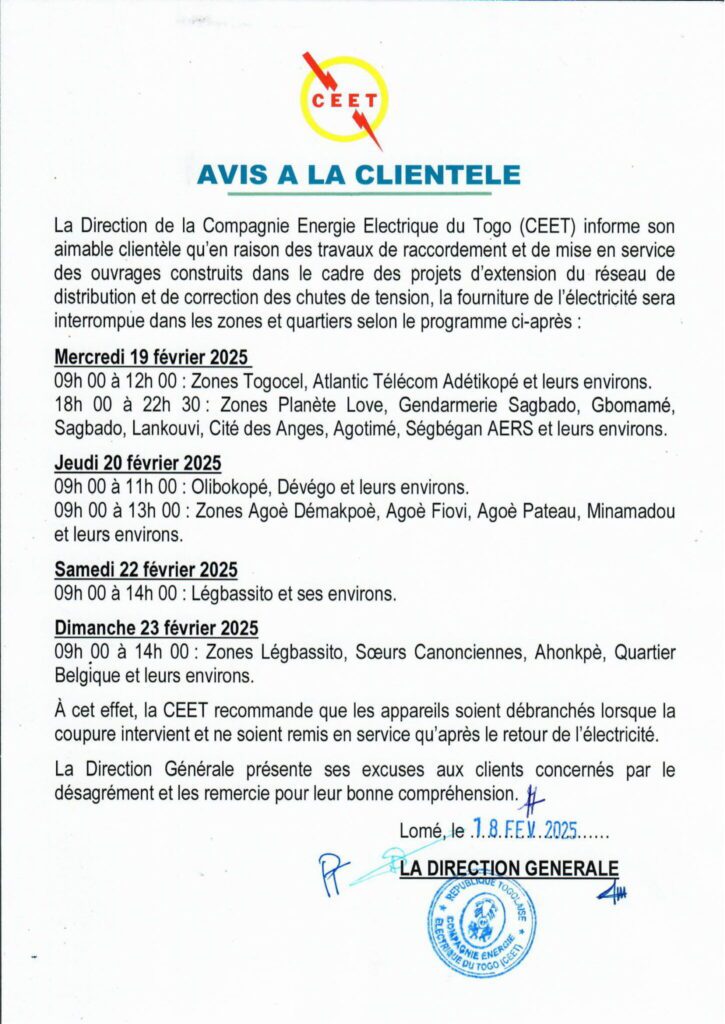La Compagnie Énergie Électrique du Togo (CEET) a annoncé une série de coupures d’électricité dans plusieurs quartiers de Lomé. Ces interruptions, programmées du 19 au 23 février 2025, sont dues à des travaux d’extension du réseau et de correction de tension.