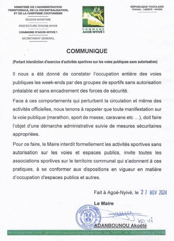Afin de renforcer la sécurité et préserver l’ordre public, la mairie d’Agoè Nyivé 1 a annoncé une réglementation plus stricte concernant les activités sportives sur la voie publique. Cette décision intervient après des constats répétés de rassemblements non autorisés de sportifs, notamment les week-ends, qui perturbent la circulation et interfèrent parfois avec des événements officiels.