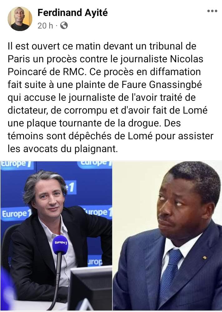 Ferdinand Ayité, un journaliste basé au Togo, a expliqué sur sa page Facebook : « Ce procès en diffamation fait suite à une plainte de Faure Gnassingbé qui accuse le journaliste de l’avoir traité de dictateur, de corrompu et d’avoir fait de Lomé une plaque tournante de la drogue. Des témoins sont dépêchés de Lomé pour assister les avocats du plaignant. »