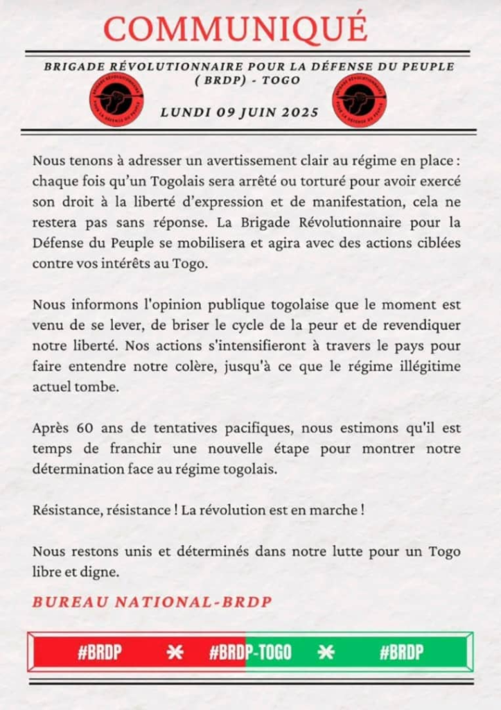 Le lundi 9 juin 2025, la BRDP (Brigade Révolutionnaire pour la Défense du Peuple) a publié un communiqué musclé, dans lequel elle adresse un message direct aux autorités togolaises. L’organisation affirme qu’elle réagira systématiquement à toute arrestation ou torture de citoyens exprimant leurs opinions ou manifestant dans les rues. « Cela ne restera pas sans réponse », promet-elle.