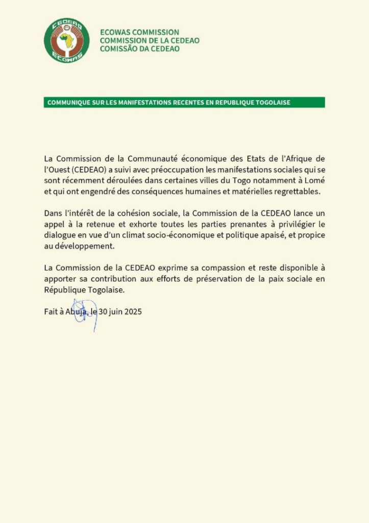 Face aux tensions croissantes qui secouent le Togo depuis les manifestations des 26, 27 et 28 juin 2025, la Communauté économique des États de l’Afrique de l’Ouest (CEDEAO) a publié, le 30 juin, un communiqué officiel depuis Abuja, exprimant sa préoccupation et appelant à la retenue de toutes les parties impliquées. Cette déclaration intervient après plusieurs jours de violences, qui ont fait au moins sept morts selon des sources concordantes, dont deux adolescents retrouvés sans vie dans la lagune de Lomé.