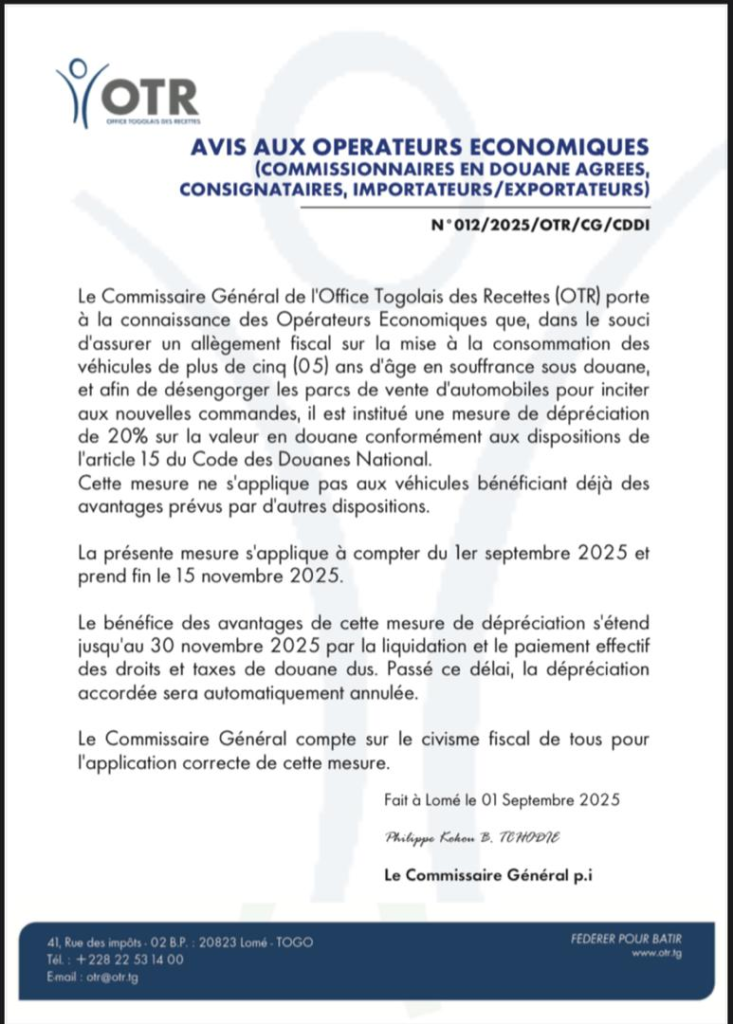 L’Office Togolais des Recettes (OTR) a annoncé, dans un communiqué signé par son Commissaire Général Philippe Kohon B. Tchodié, l’instauration d’une dépréciation de 20 % sur la valeur en douane des véhicules de plus de cinq ans. Cette disposition concerne les voitures encore en souffrance sous douane et vise principalement à réduire la pression sur les parcs de vente d’automobiles, tout en stimulant de nouvelles importations.