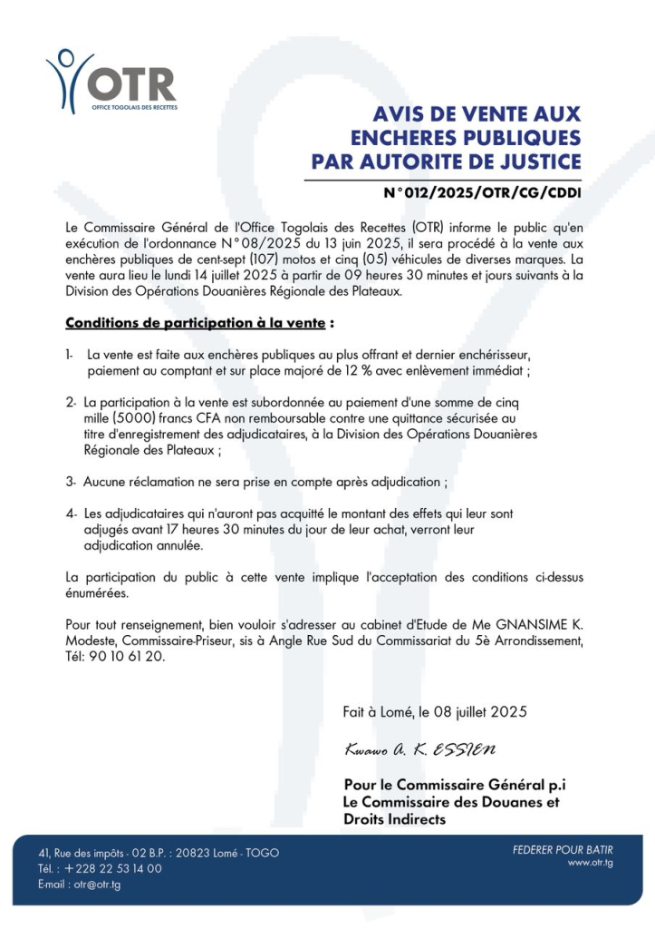 Cette vente fait suite à l’exécution de l’ordonnance N°08/2025 du 13 juin 2025, comme l’indique l’avis officiel signé par Kuwou A. K. Essien, Commissaire des Douanes et Droits Indirects, assurant l’intérim du Commissaire Général de l’OTR. Elle est conduite conformément aux textes en vigueur sur les ventes aux enchères publiques par autorité de justice.
